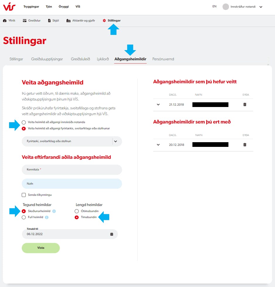 Tryggingatakar geta til dæmis veitt maka, umboðshafa, endurskoðanda eða bókara aðgang að tryggingaupplýsingum sínum með því að skrá sig inn á vis.is og velja aðgangsheimildir.