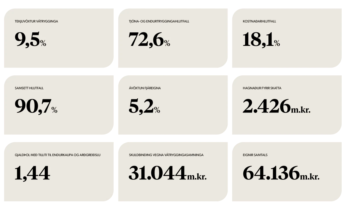 ásamt lykiltölum og helstu niðurstöðum sem veita yfirlit yfir rekstur og fjárhagsstöðu tryggingasamstæðunnar.