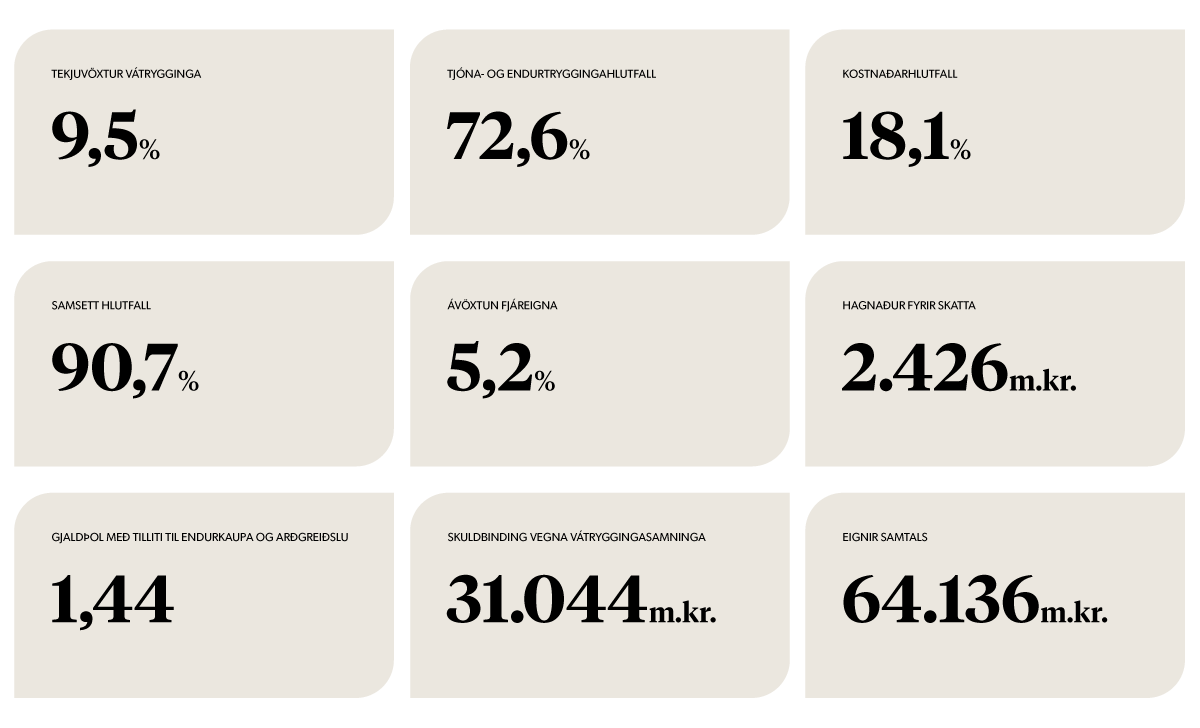 ásamt lykiltölum og helstu niðurstöðum sem veita yfirlit yfir rekstur og fjárhagsstöðu tryggingasamstæðunnar.