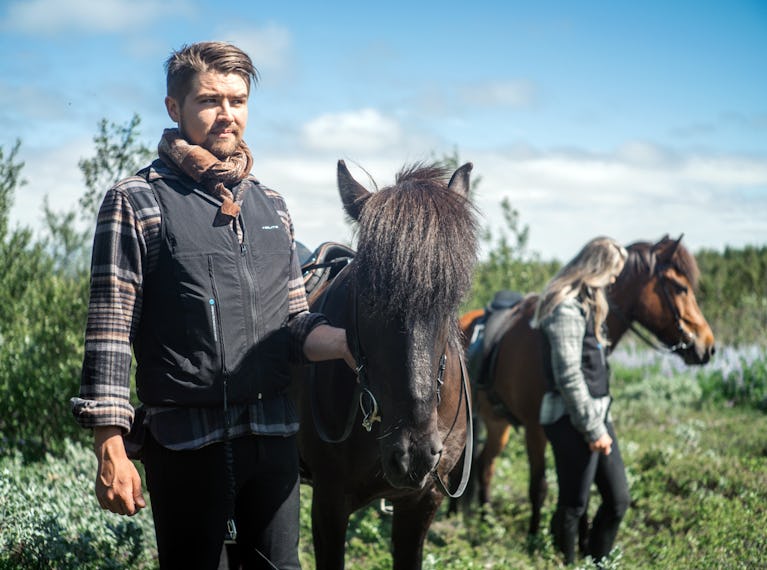 - Taumur frá vesti festist við hnakk og við fall kemur tog á tauminn og loftpúðinn blæs út