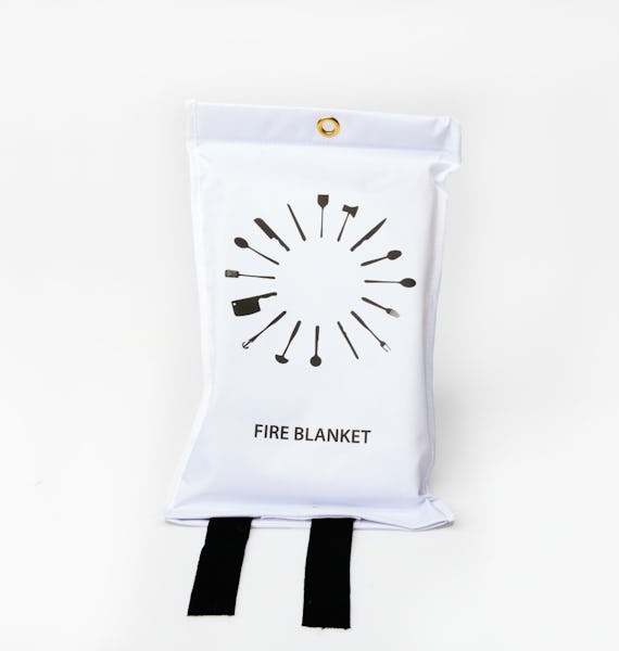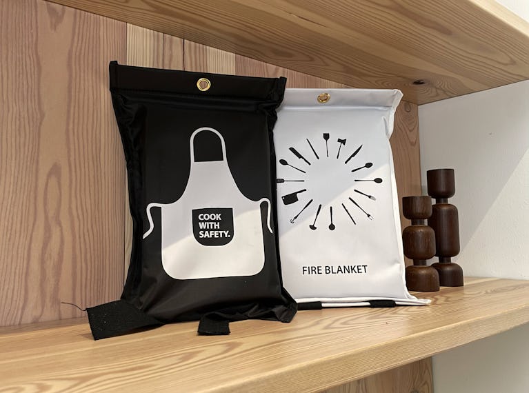 Stílhreint og falleg eldvarnateppi sem sómir sér vel í hvaða eldhúsi sem er. Hangandi upp á vegg, bara ekki of nærri eldavélinni þar sem þarf að vera hægt að ná í það ef kviknar í.