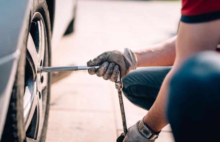 Tjakk, felgulykill og varadekk eða kvoðuviðgerðarsett.